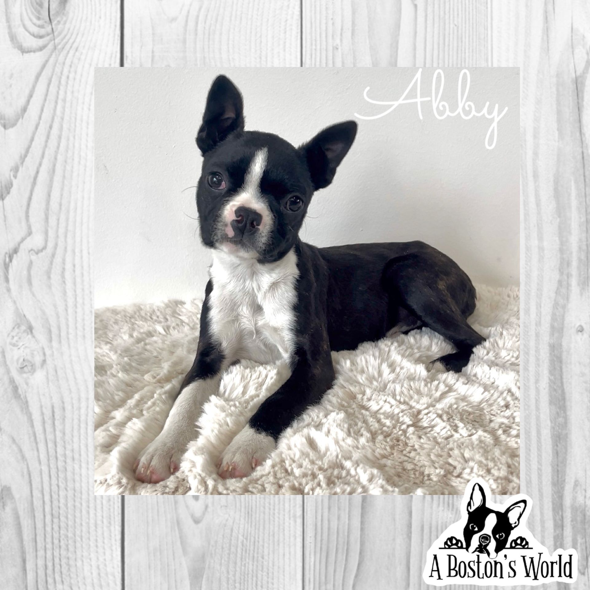 Abby DOB: January 28th, 2025Color: Brindle/Black/WhiteSex: FemaleParents: Maxwell~ LacyBreed: Boston Terrier